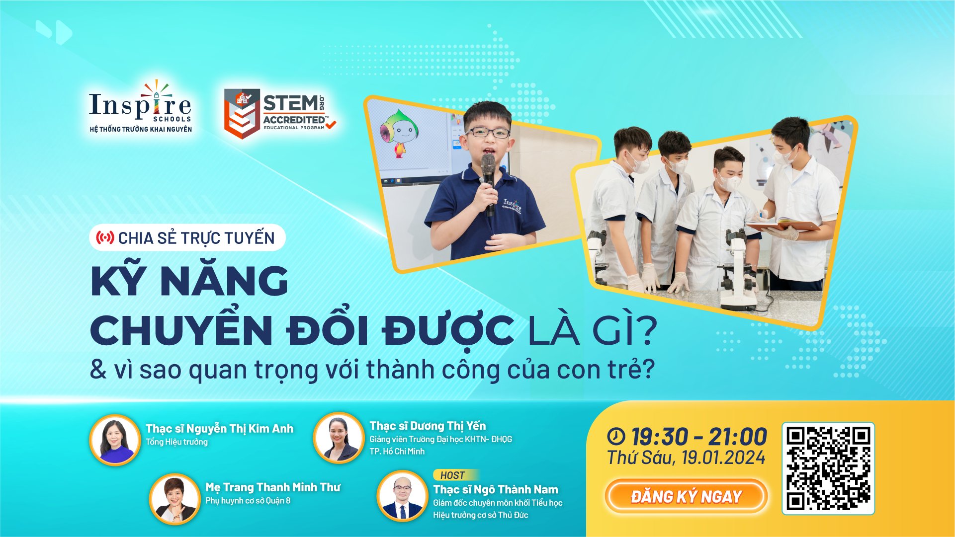 🔴Kính mời Ba mẹ đến với buổi chia sẻ “KỸ NĂNG CHUYỂN ĐỔI ĐƯỢC LÀ GÌ? VÀ VÌ SAO QUAN TRỌNG VỚI THÀNH CÔNG CỦA CON TRẺ?” do Inspire – Khai Nguyên tổ chức để cùng các Chuyên gia giáo dục: